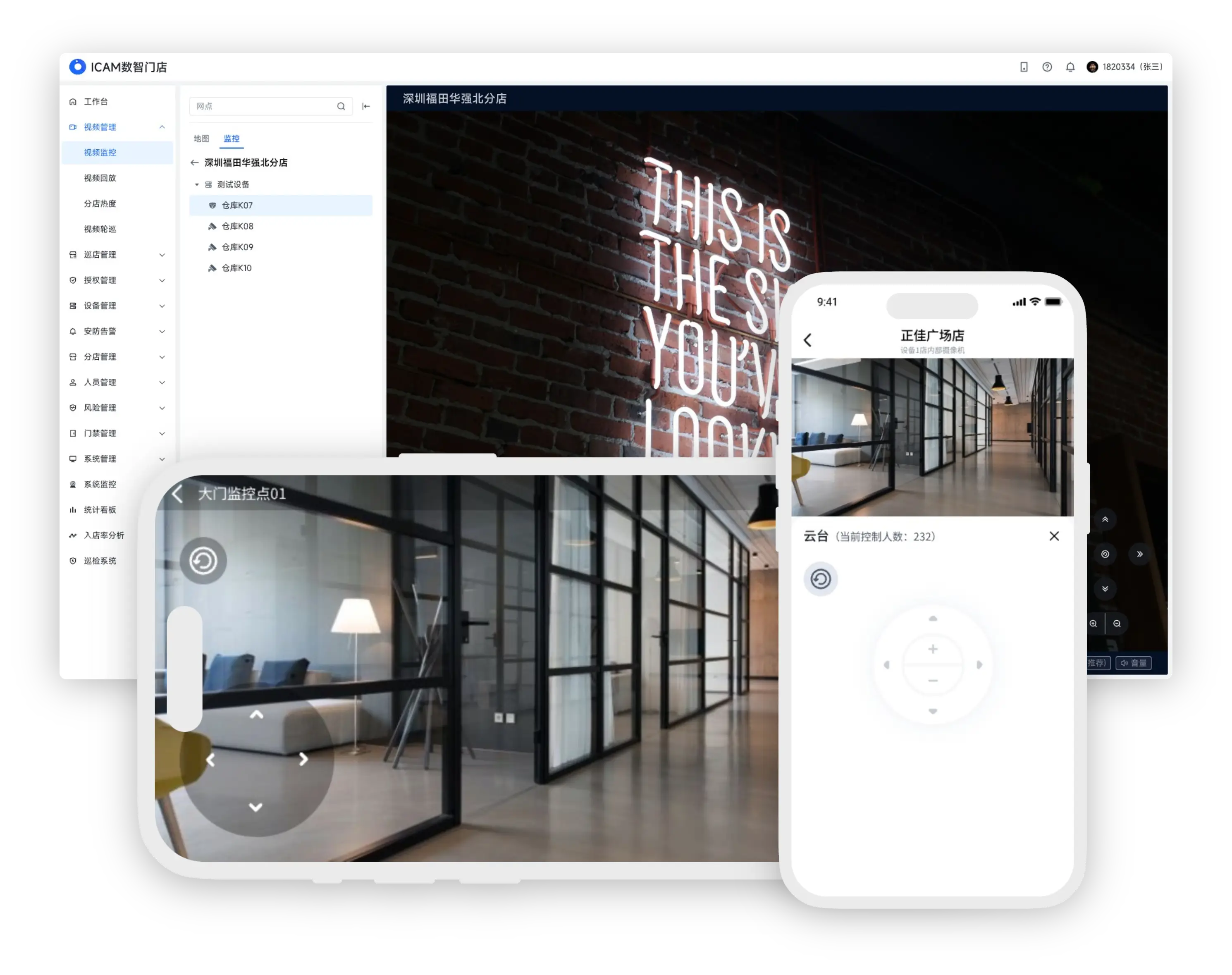 视频巡店、360°云台智控,分时段查看视频回放,品牌可自定义巡店考核标准、线上线下结合巡店打分